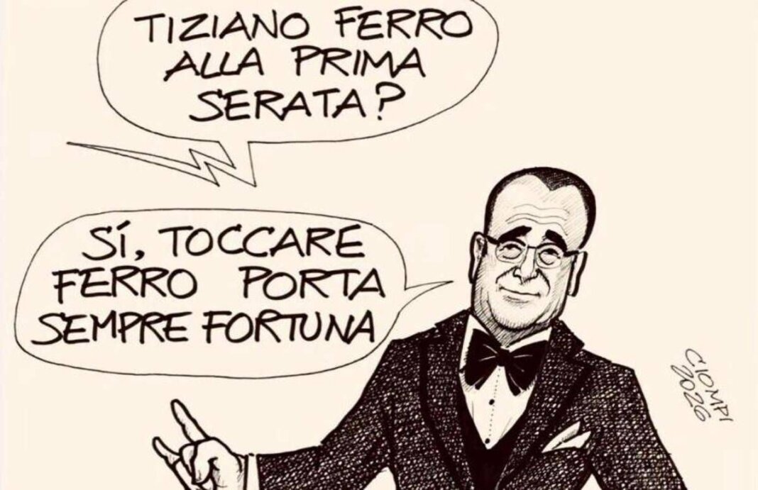 Conti ha pubblicato su Instagram una vignetta che gli ha dedicato Guido Ciompi, dove, a una voce fuoricampo che gli chiede “Tiziano Ferro alla prima serata?”, il conduttore, mentre fa le corna con una mano, risponde: “Sì, toccare ferro porta sempre fortuna”.